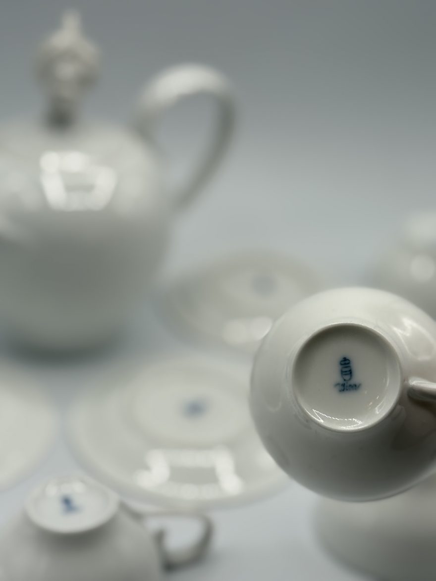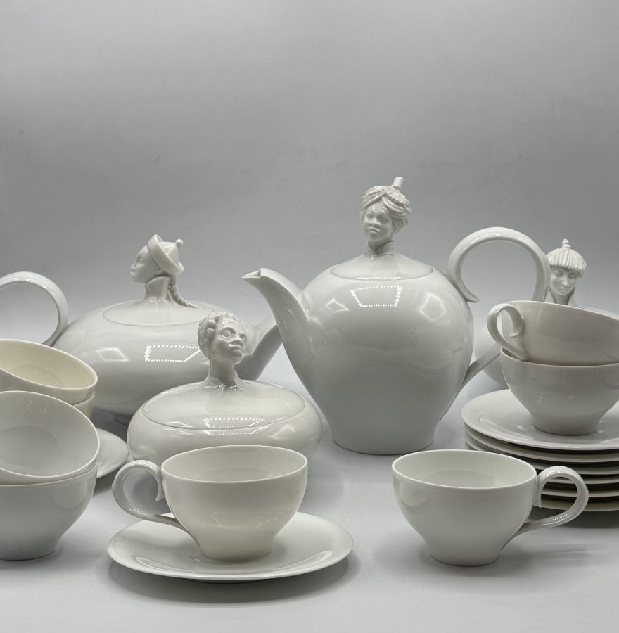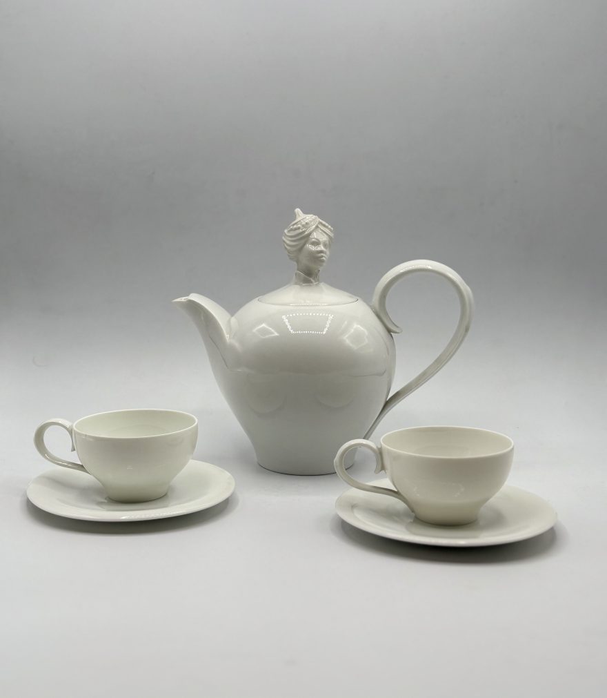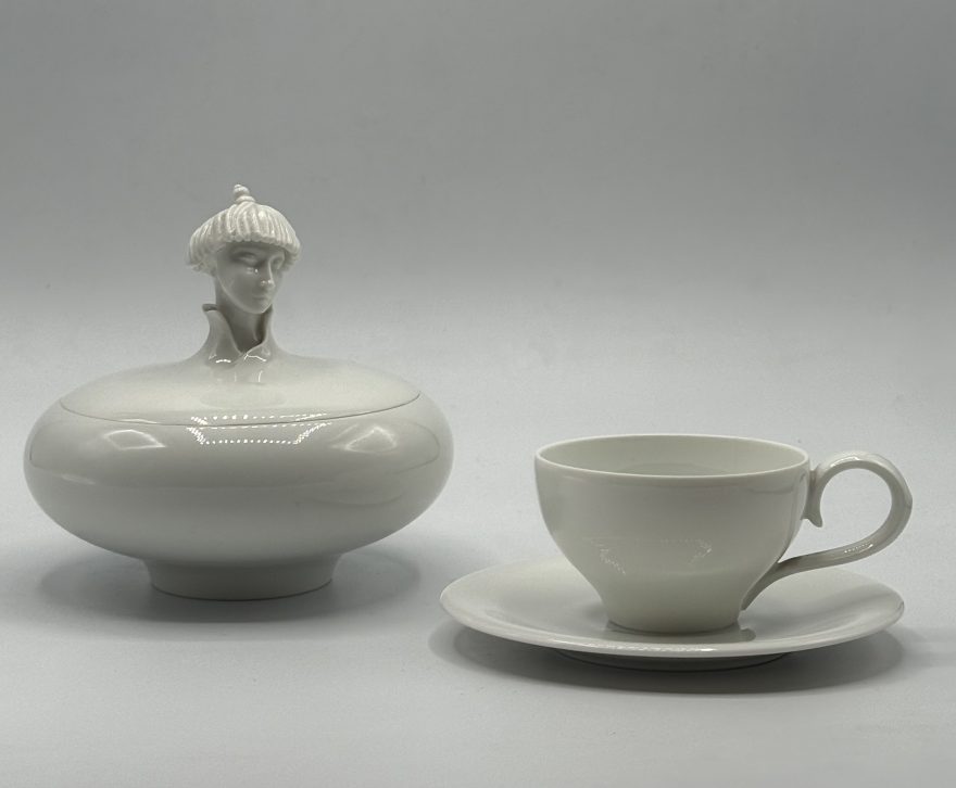 The ORIENT version (Form No. 20) is distinguished by sculptural lid finials in the form of so-called “exotic heads.” These finely modelled figures—appearing on coffee and tea vessels such as the coffee pot, teapot, terrine, sugar bowl, saucière, and covered dishes—were intended to symbolically reference regions historically associated with the origins of coffee and tea. Contemporary descriptions identify the figures as representing India, Southeast Asia, China, and Africa.