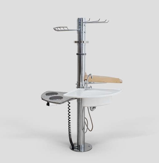 A column made of chrome-plated steel conceals cables and water pipes, surrounded by everything one might need in a kitchen: an electric stove, sink, work surface, and dish rack, as well as hooks for hanging pots or dish towels. Even a spice rack is included. The arrangement of the functional elements can be adapted to individual needs.